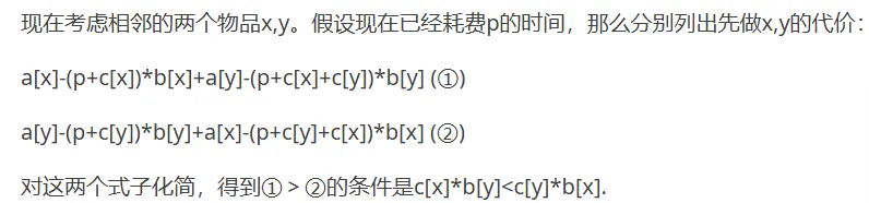 #include<bits/stdc++.h> using namespace std; typedef long long LL; const int N=100010; LL f[N]; int n,t; struct P { int a; int b; int c; }fd[N]; bool cmp (P x, P y) { return (LL)x.c*(LL)y.b<(LL)y.c*(LL)x.b; } int main() { cin>>t>>n; for(int i=1;i<=n;i++) cin>>fd[i].a; for(int i=1;i<=n;i++) cin>>fd[i].b; for(int i=1;i<=n;i++) cin>>fd[i].c; sort(fd+1,fd+1+n,cmp); for(int i=1;i<=n;i++) for(LL j=t;j-fd[i].c>=0;j--)//这里j得用LL { f[j]=max(f[j],f[j-fd[i].c]+fd[i].a-j*fd[i].b); } LL res=0; for(int i=1;i<=t;i++) res=max(f[i],res); cout<<res; return 0; }