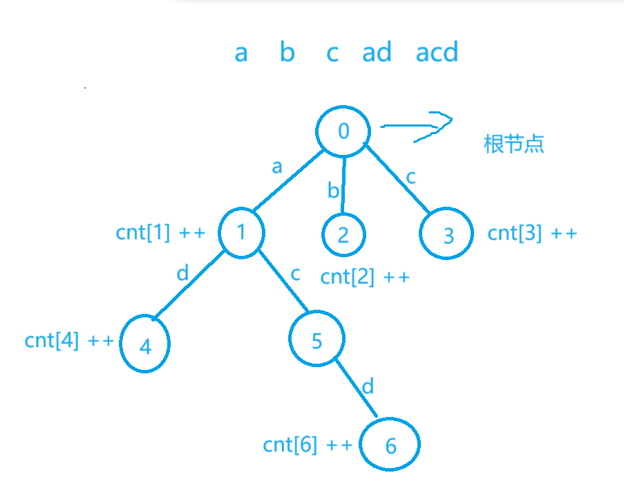 void insert(string s) { int u = 0; for(int i = 0; i < s.size(); i ++) { int v = s[i] - 'a'; if(!ch[u][v]) ch[u][v] = ++idx;//如果没有这个点,我们就创建这个点,并且记录其编号为0,1...n-1,n u = ch[u][v];//如果存在这个点,我们就将u修改为边的起点 } cnt[u] ++;//记录以u这条边上的字符为结尾的字符串 } ll query(string s) { int u = 0; for(int i = 0; i < s.size(); i ++) { int v = s[i] - 'a'; if(!ch[u][v]) return 0;//如果不存在这个点,返回0 u = ch[u][v];//如果存在这个点 } return cnt[u];//存在这个点就返回,看是否有以u为终点的字符串 }分析 树的时间复杂度: